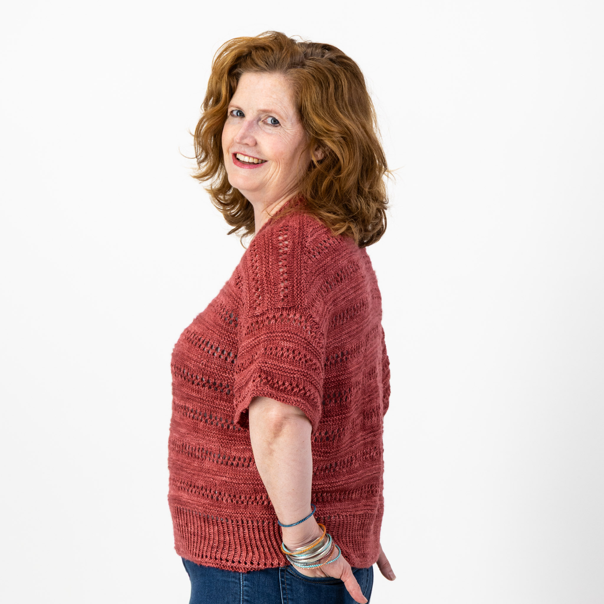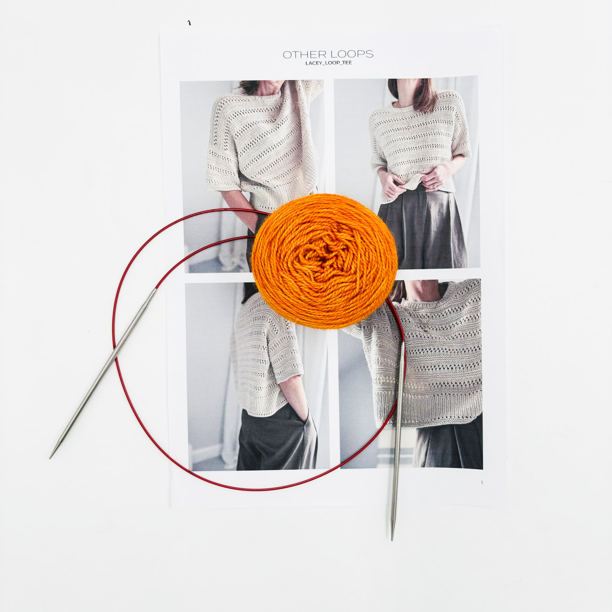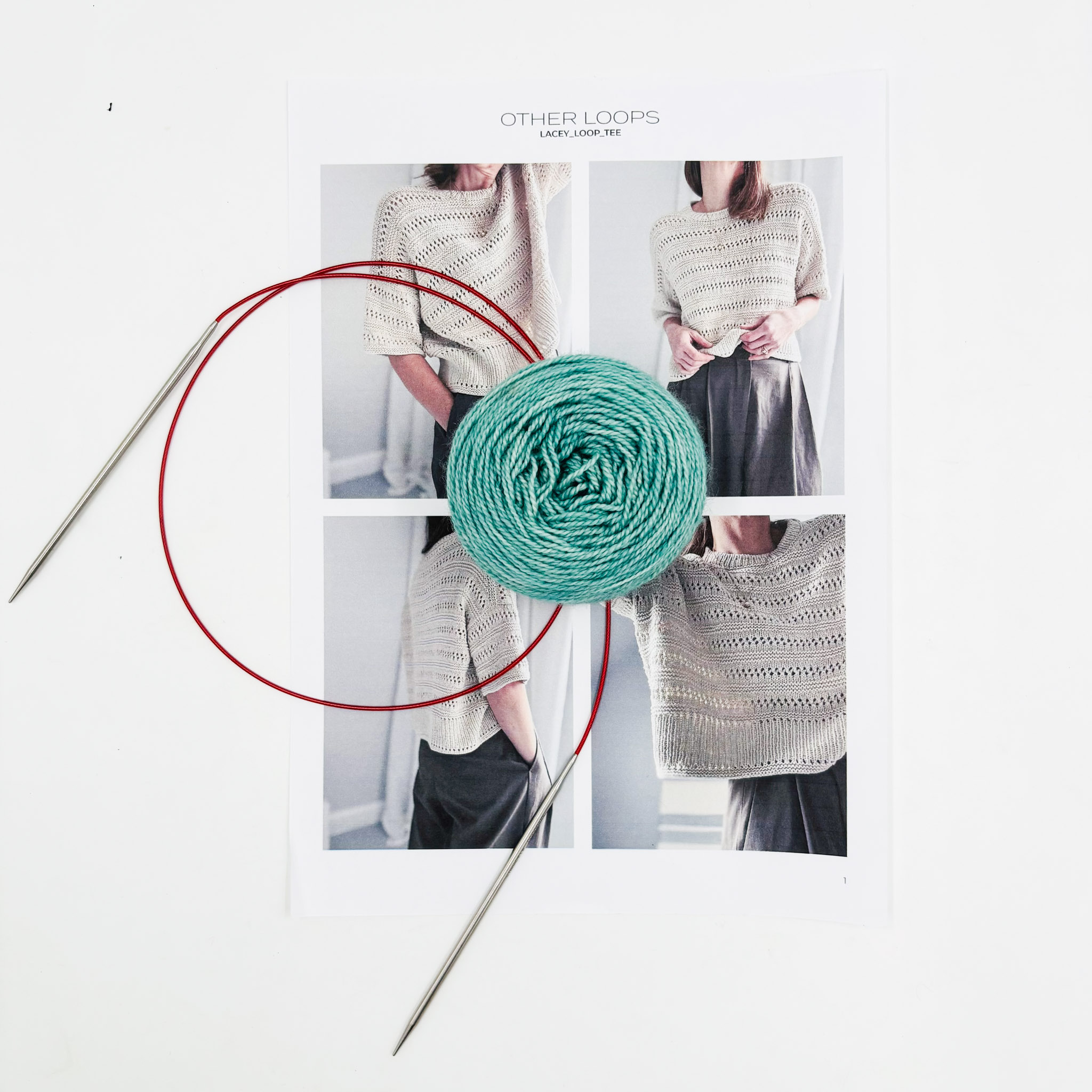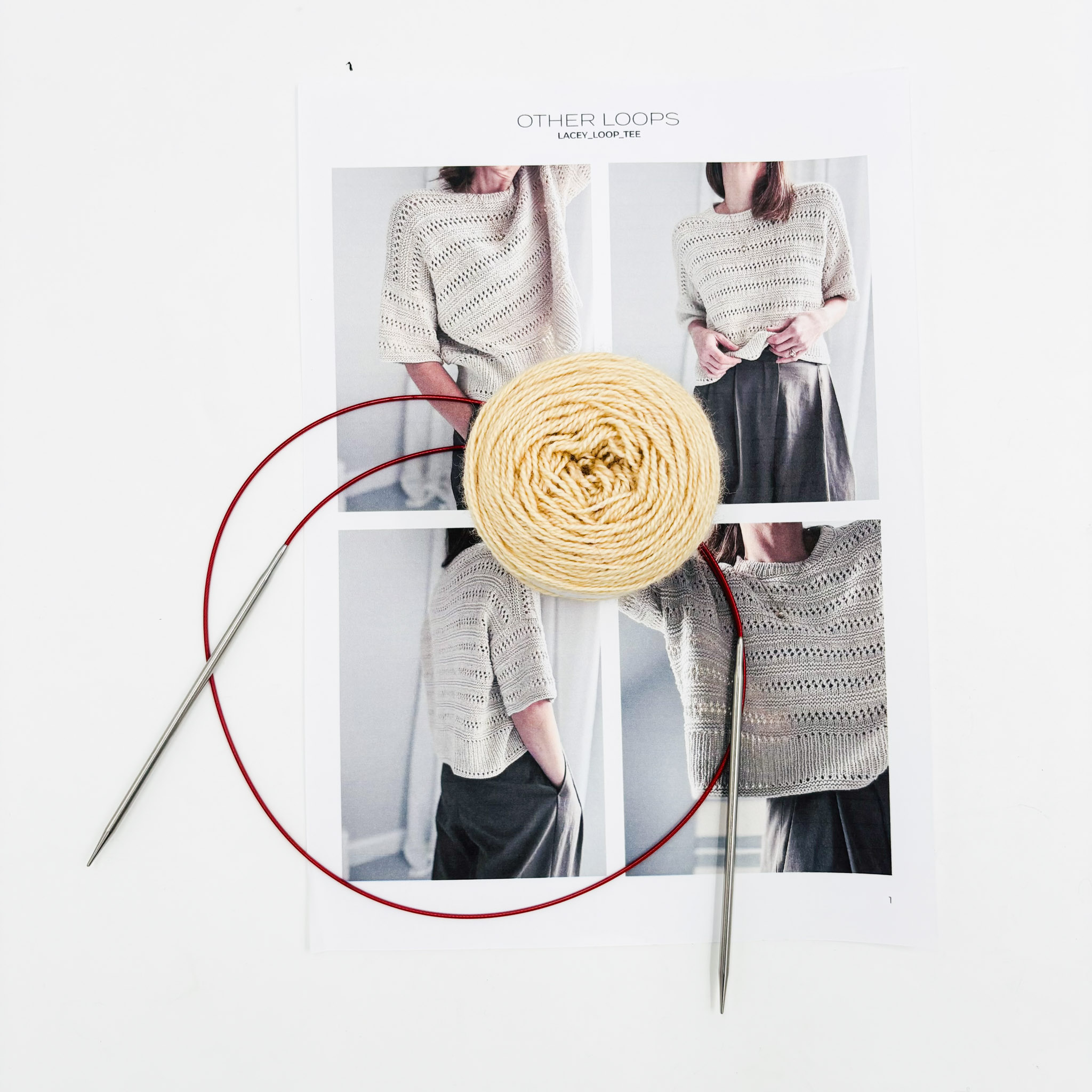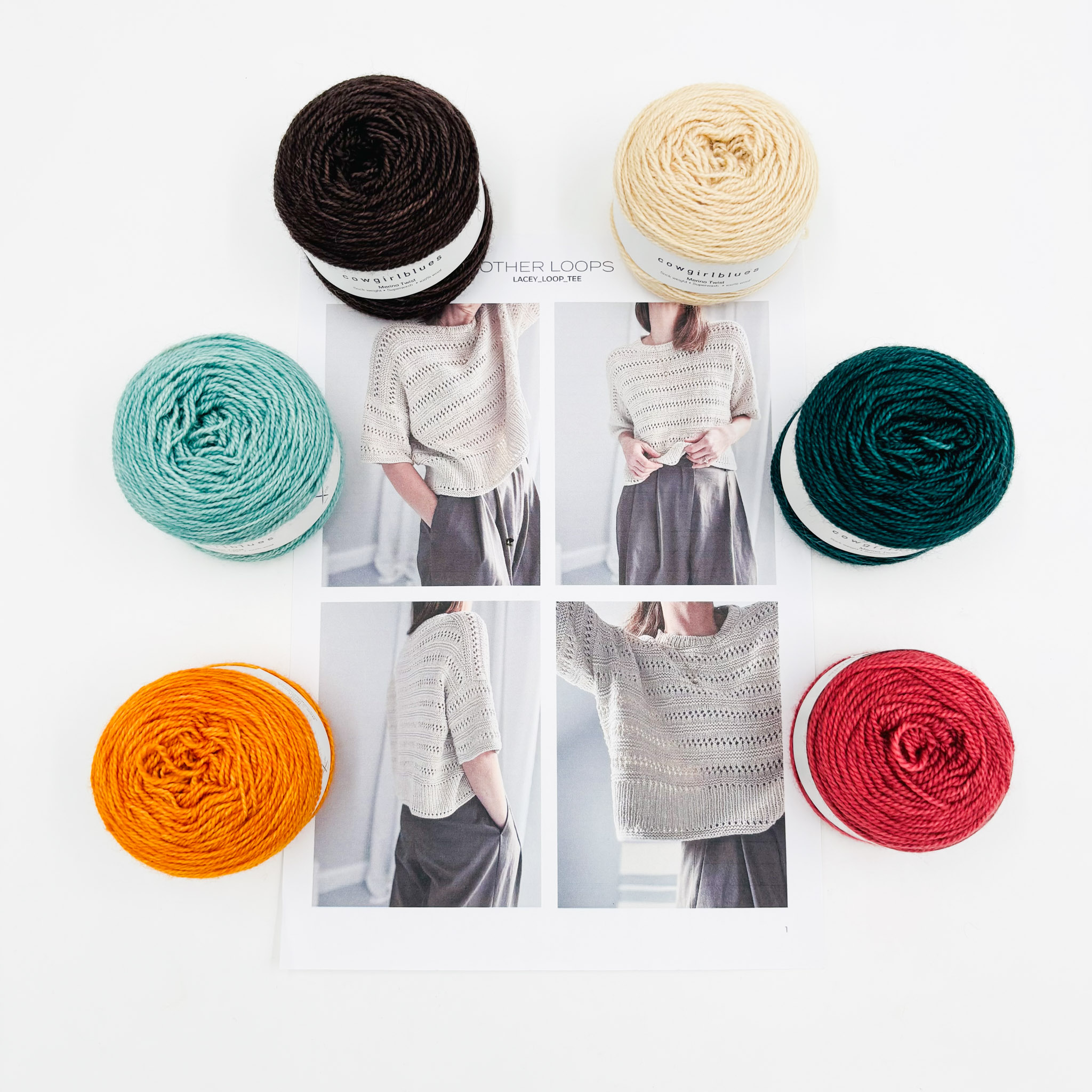 The Lacey Loop Tee is knit top-down, forming a loose fit with a classic round neck. It features a feminine eyelet pattern, unique ribbing edges, and purl-stitch stripes. The pattern recommends a DK weight, but we made it in our Merino Twist yarn to give the garment lovely drape.