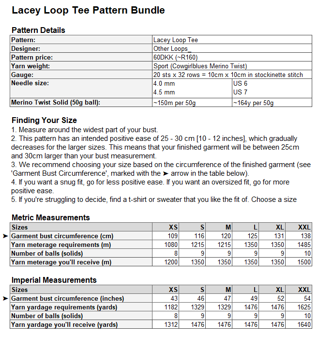 Look to the table in the images to find your preferred fit. Then select your size in the drop-down menu below. When you select your size, the corresponding quantity of yarn will be automatically calculated. We’ve grouped sizes with the same yarn quantity requirements (e.g. Size S – XL).